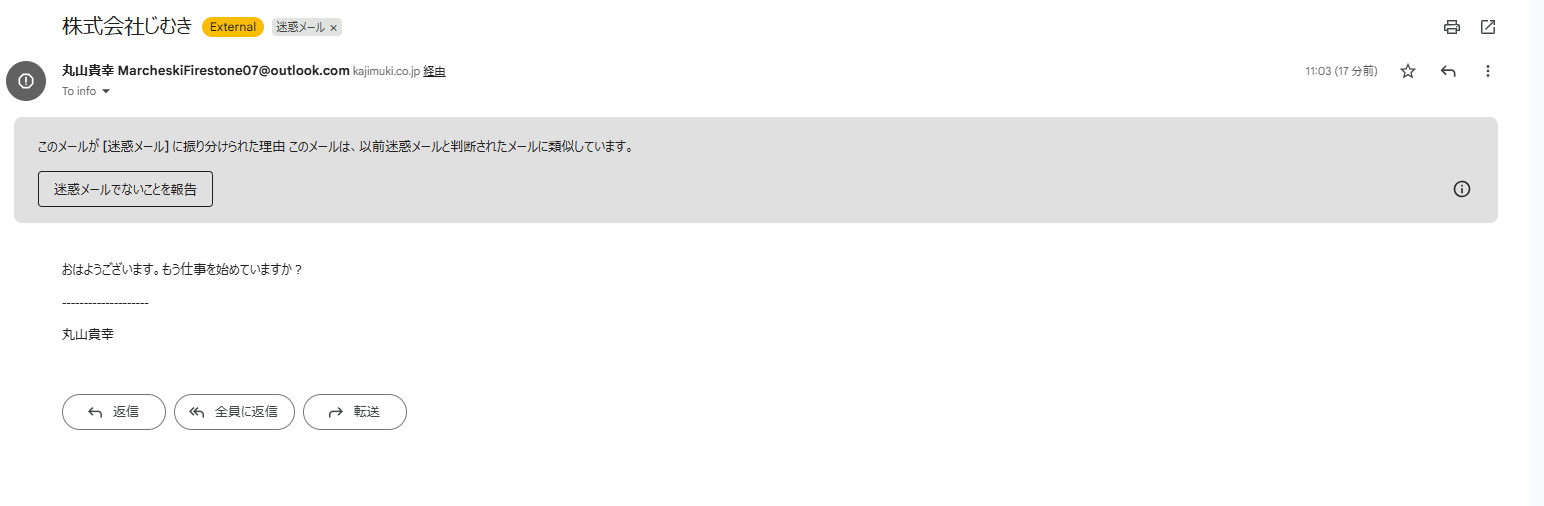 でも、よく見るとメールアドレスが会社のものではなく、outlook.comになっています。GmailやYahooメールの場合もありますが、これは詐欺です。
