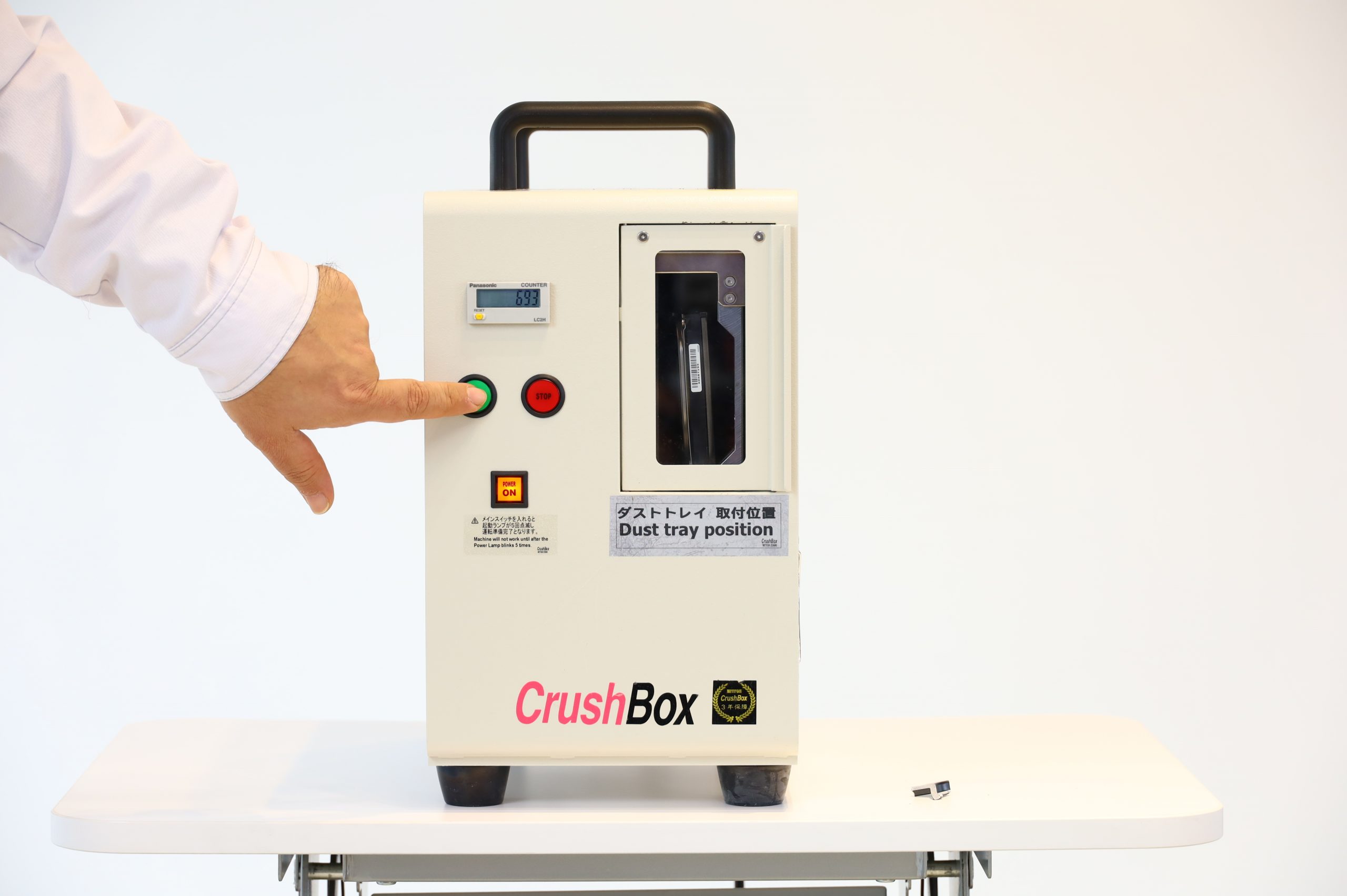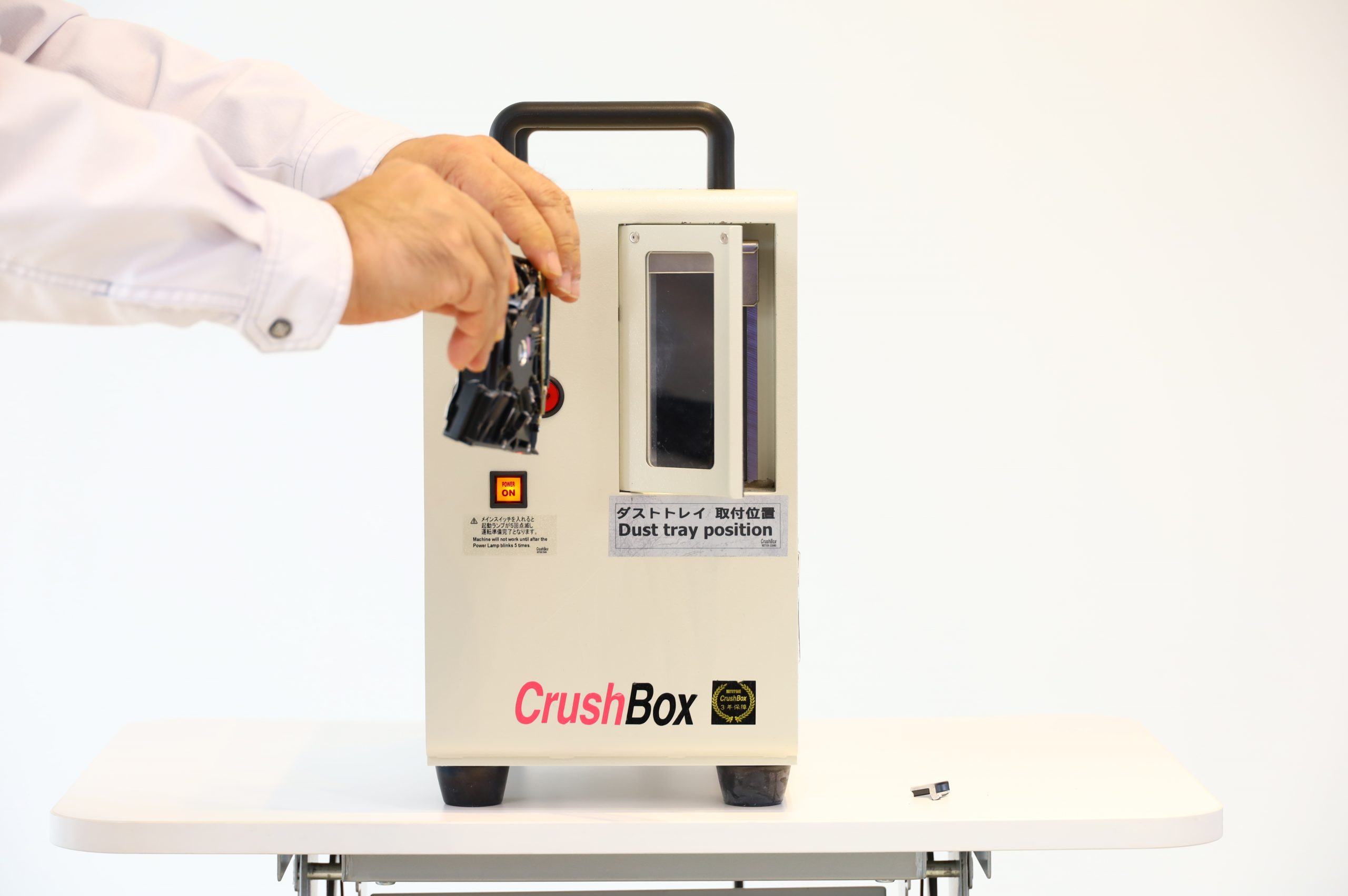 私たちが所有しているハードディスク破砕機を使って、目の前で破砕作業をすることが可能です。