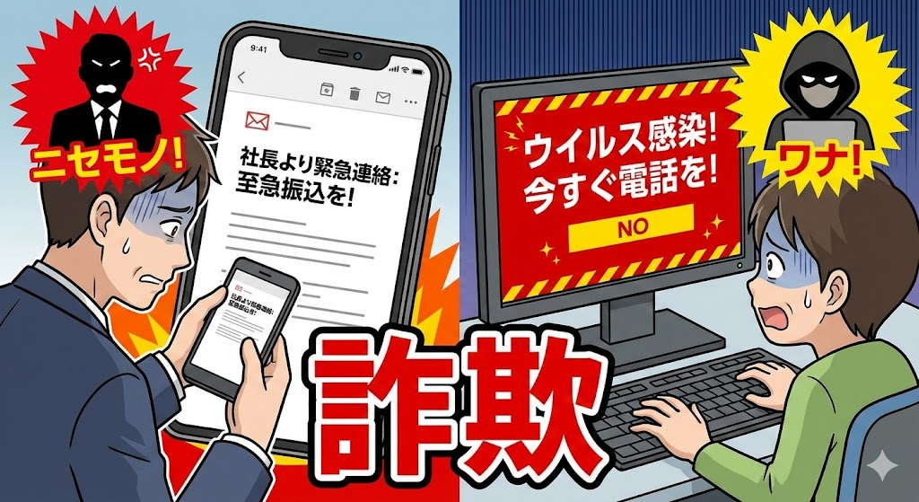 2026年1月28日 セキュリティ対策フィッシングメール 【要注意】「社長からのメール」や「パソコンの警告画面」は詐欺かも! 最近、身近なところでメールや画面表示を使った詐欺が増えています。「自分は大丈夫」と思っていても、忙しい時や慌てている時ほど騙されやすいもの。今回は特に多い2つの手口をご紹介します。1.社長や上司を装った偽メール ある日突然、社長の名前でこんなメールが届きます。「今、手が離せない。… 2026年1月28日 セキュリティ対策 【要注意】「社長からの… 最近、身近なところでメールや画面表示を使った詐欺が増えていま…